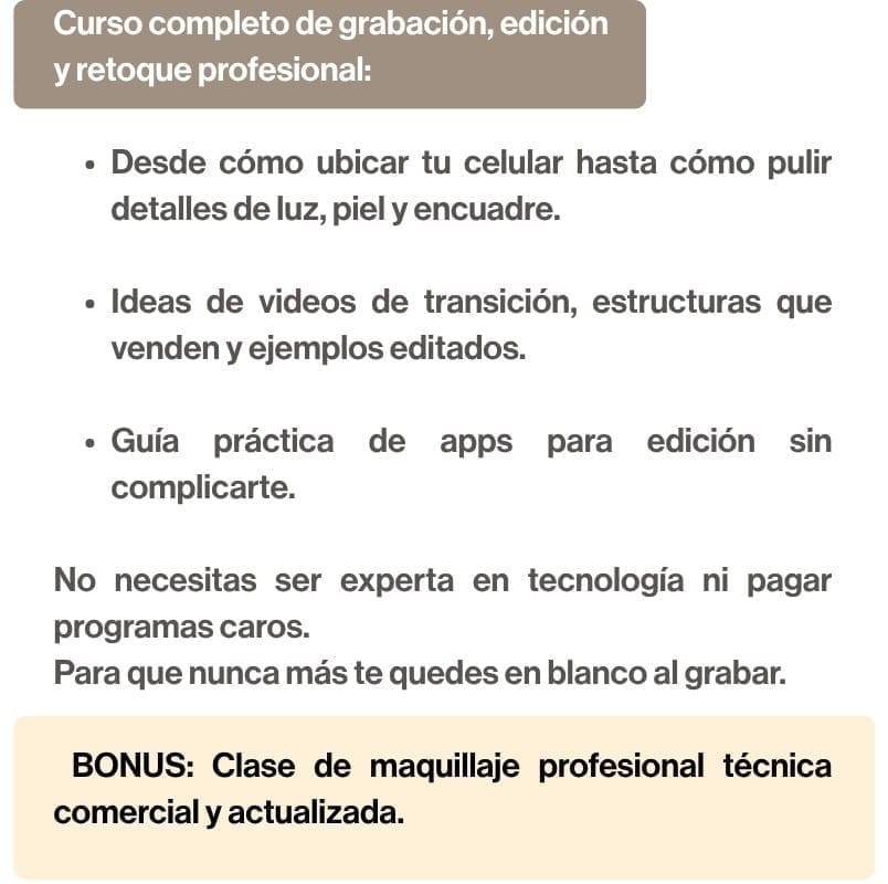No. El curso está diseñado para maquilladoras de todos los niveles. Aprenderás desde cero a grabar, editar y mejorar tus fotos y videos con técnicas fáciles y efectivas.
