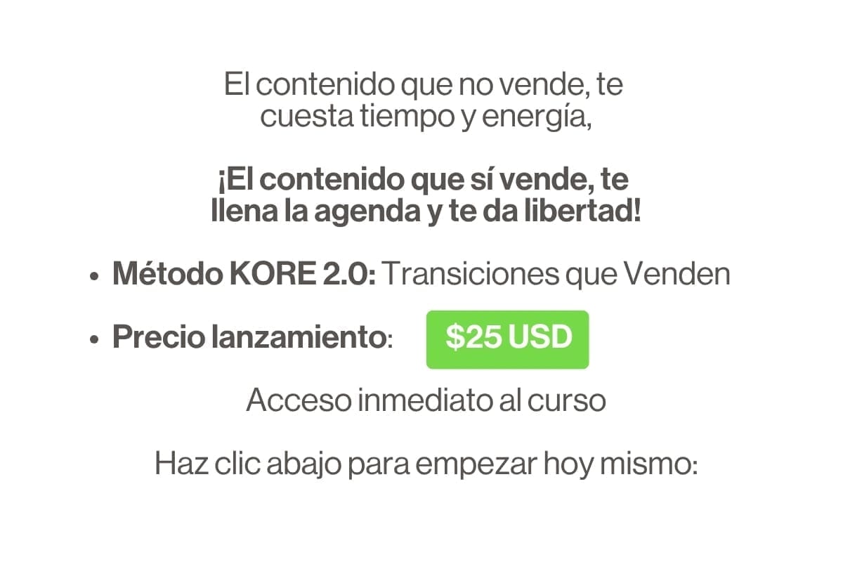 No es obligatorio. El Método KORE te enseña a crear contenido visual poderoso con o sin mostrar tu rostro, usando transiciones, planos estratégicos y efectos que venden por ti.